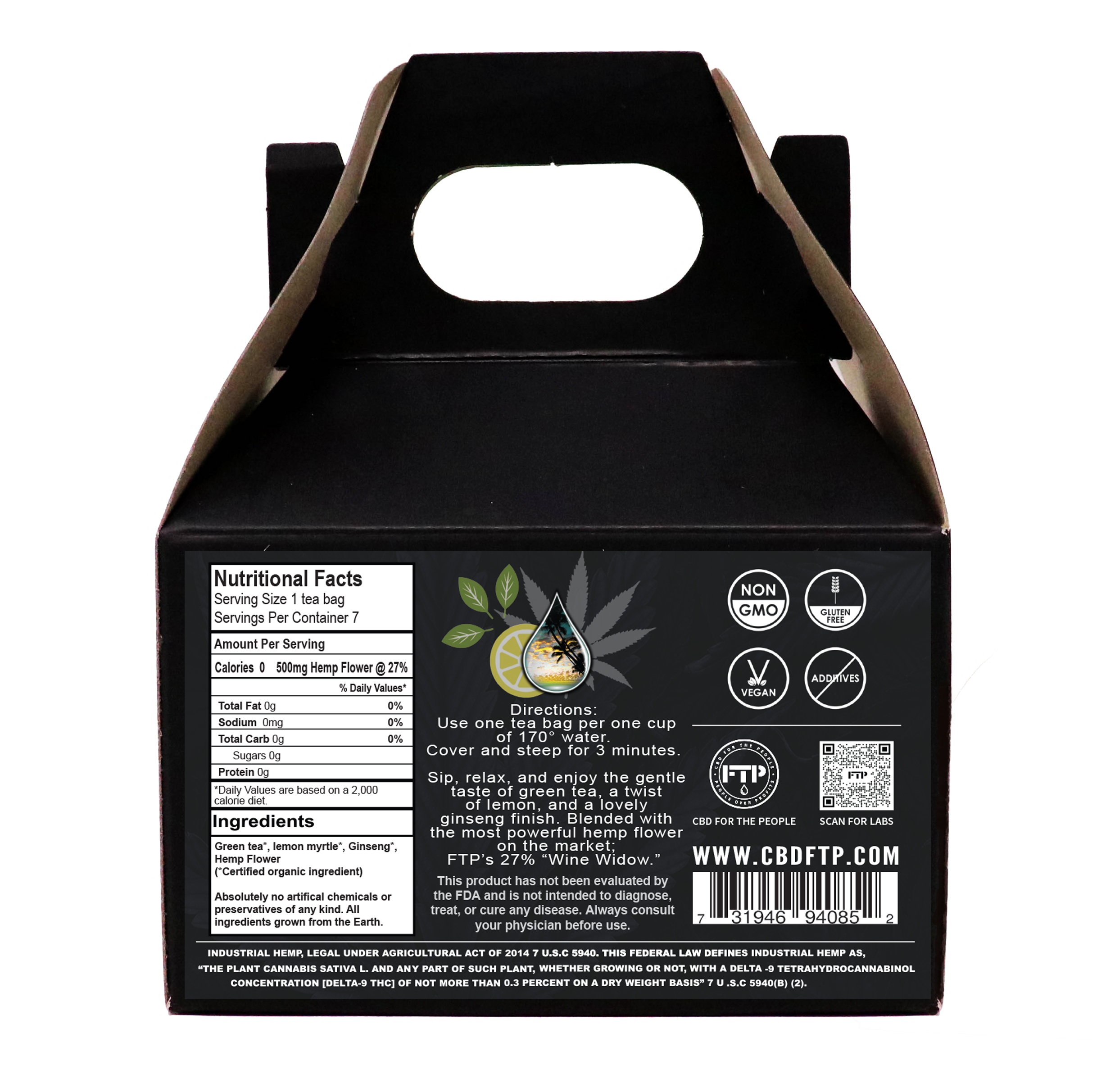 Ingredients: FTP’s Wine Widow (27%) hemp is now available combined with organic lemon ginseng green tea.